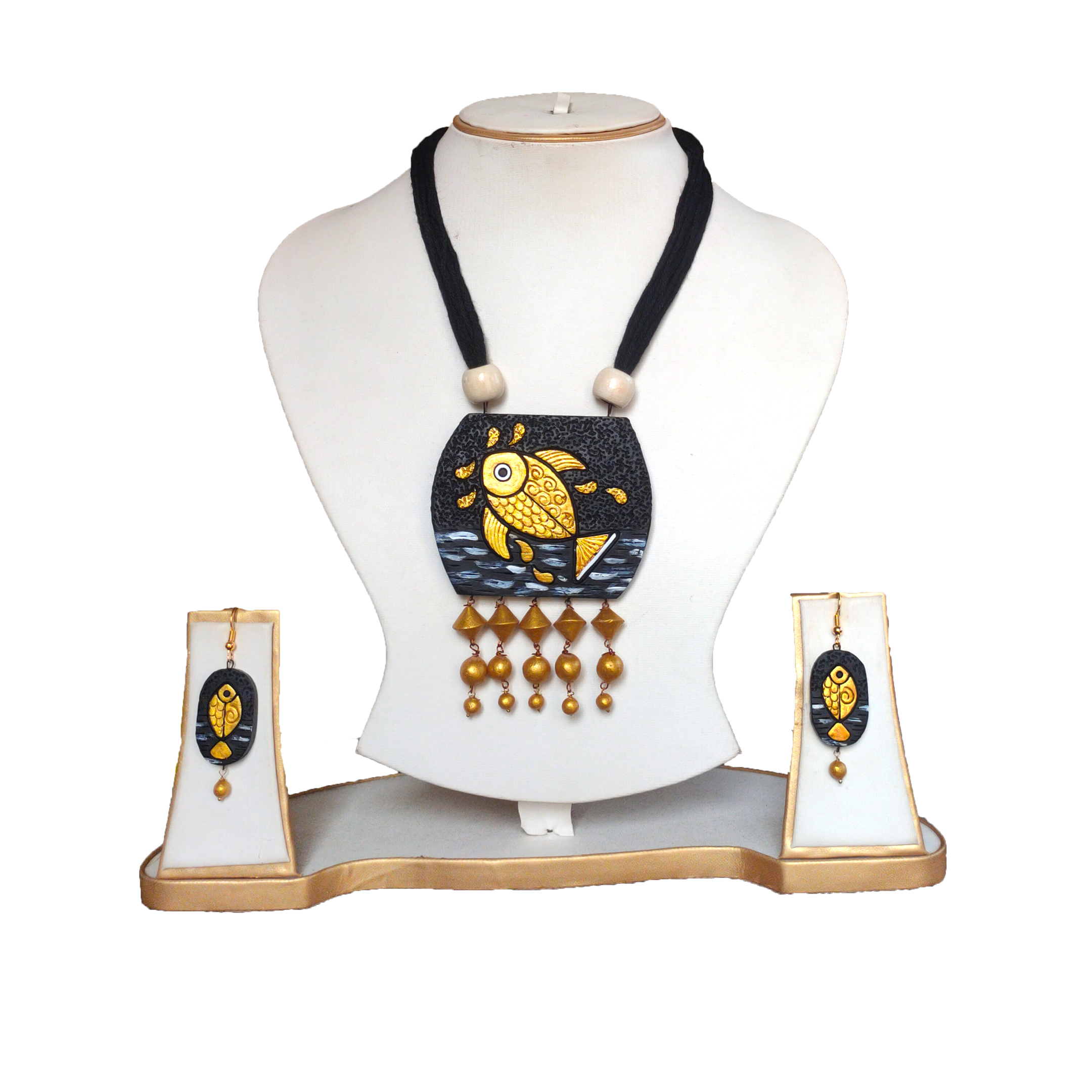 This beautiful Black & Gold Fish Terracotta Necklace Set is made from eco-friendly natural clay, carefully shaped and hand-painted by skilled artisans. The set includes a matching necklace and a pair of earrings that reflect traditional Indian craftsmanship.